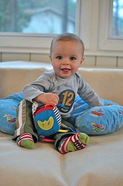 Month 8 was a smiley one…we struggled to keep this little guy still and keep my hands out of the picture, but not let him fall off this chair! See?